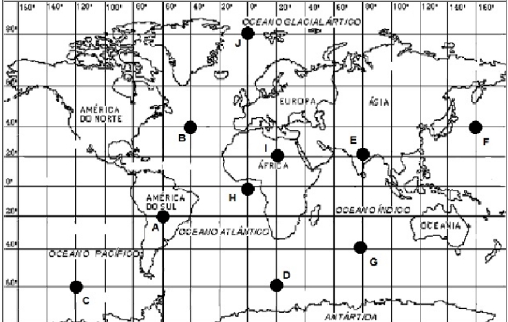 9. Dê as coordenadas geográficas dos pontos mostrados no planisfério a seguir: