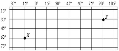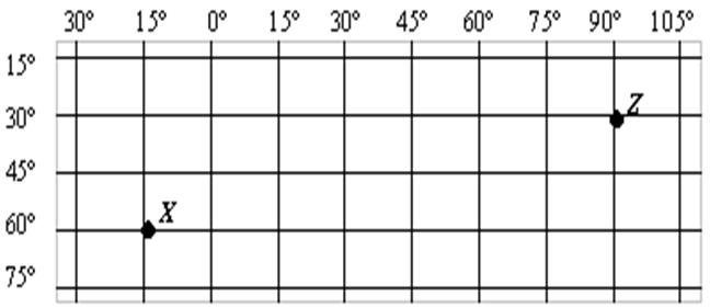 3 Questão:Analise a figura abaixo e assinale a opção que corresponde, respectivamente, às coordenadas geográficas dos pontos X e Z.