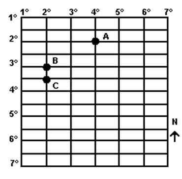 a) 3° de latitude Norte e 2° de longitude Oeste.