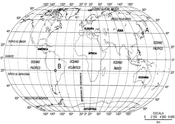 As coordenadas geográficas dos pontos A e C são, respectivamente,